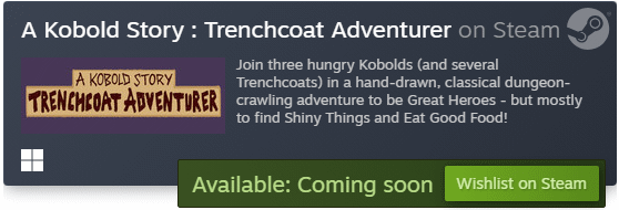 Three Kobolds find themselves drawn to the allure of Adventuring after overhearing how successful adventurers get to eat the best food and have the shiniest shiny things. Cunningly disguised in a trenchcoat, this towered trio find their way though an ever-deepening dungeon in the hunt for shinies and tasties!